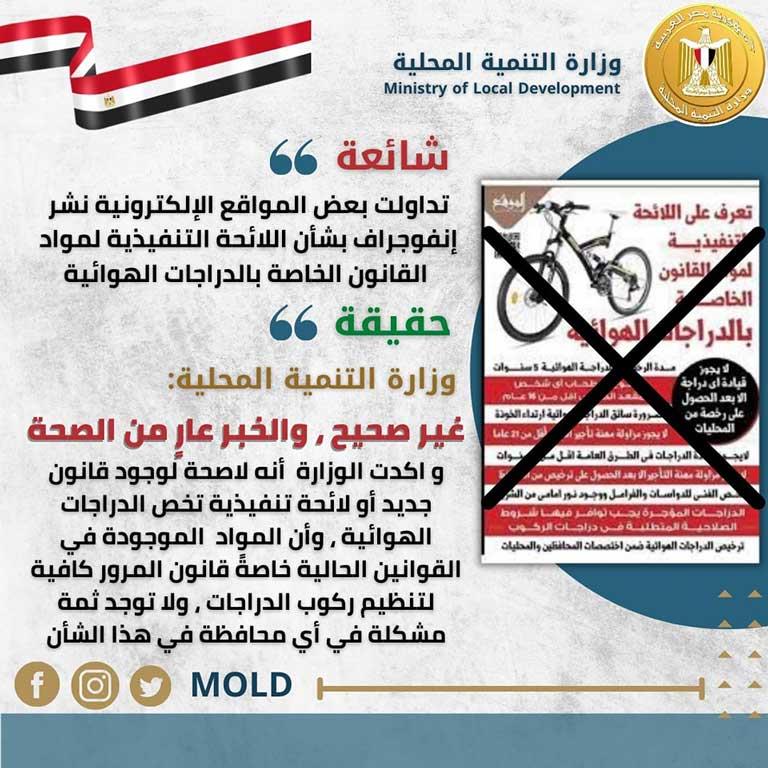 نفت وزارة التنمية المحلية، ما نشرته بعض المواقع بشأن اللائحة التنفيذية لقانون الدراجات الهوائية.