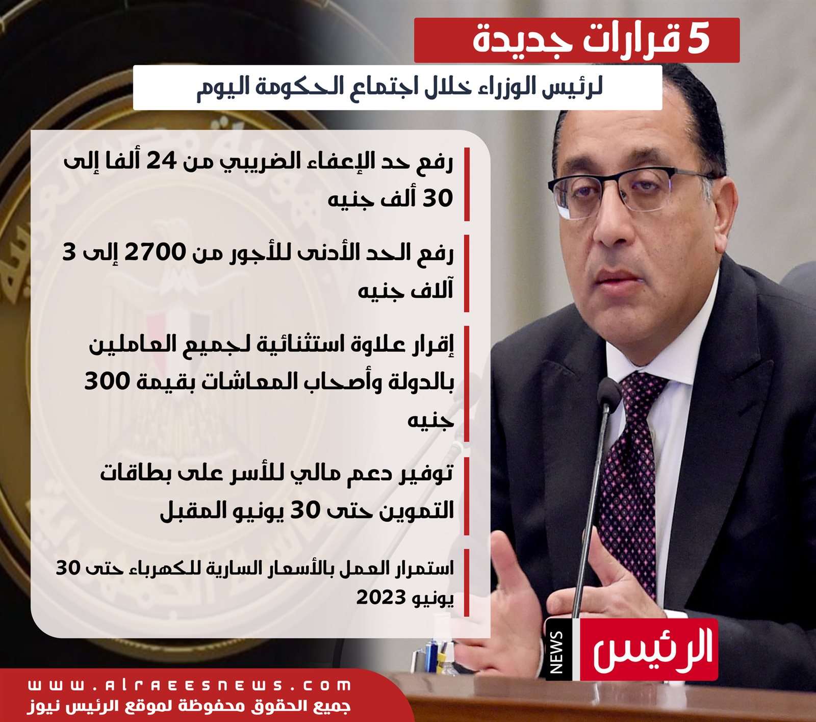وتابع فى مؤتمر صحفى، أن مجلس الوزراء قرر رفع الحد الأدني للأجور من 2700 جنيه لـ3000 جنيه، مع استمرار عدم زيادة الكهرباء حتى 30 يونيو 2023 وإقرار علاوة استثنائية لمجابهة غلاء المعيشة بقيمة 300 جنيه لجميع العاملين بالدولة.