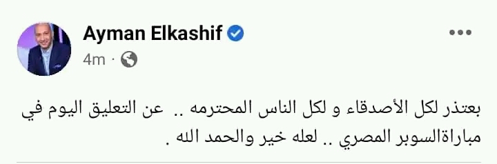 وفور تصريحات مرتضى منصور أعلن المعلق الرياضي أيمن الكاشف، عن اعتذاره للجمهور عن التعليق على مباراة السوبر المصري بين الأهلي والزمالك، وكتب عبر صفحته الرسمية على تويتر: "اعتذر لكل الأصدقاء وكل الناس المحترمة عن التعليق على مباراة السوبر المصري اليوم، لعله خير الحمدلله".