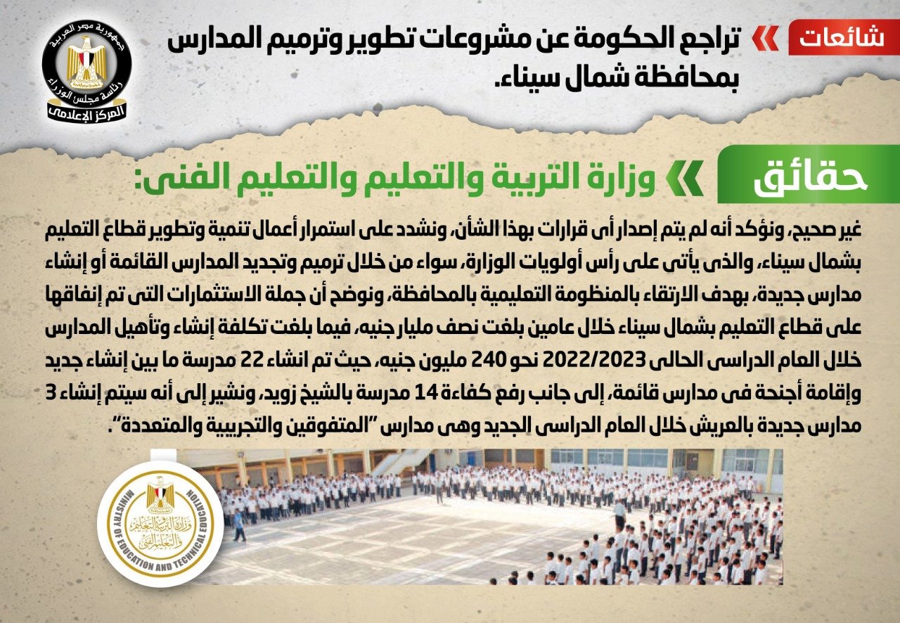 وأكدت وزارة التعليم أنه لا صحة لتراجع الحكومة عن مشروعات تطوير وترميم المدارس بمحافظة شمال سيناء، وأنه لم يتم إصدار أي قرارات بهذا الشأن، مُشددةً على استمرار أعمال تنمية وتطوير قطاع التعليم بشمال سيناء، والذي يأتي على رأس أولويات الوزارة، سواء من خلال ترميم وتجديد المدارس القائمة أو إنشاء مدارس جديدة، بهدف الارتقاء بالمنظومة التعليمية بالمحافظة.