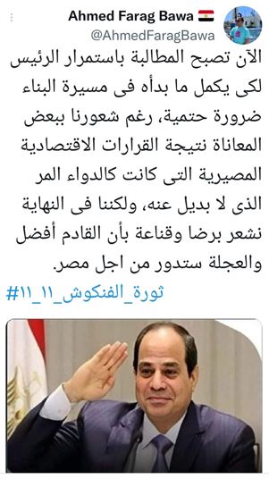 وكتب أحمد فرج على تويتر: «الآن تصبح المطالبة باستمرار الرئيس لكى يكمل ما بدأه فى مسيرة البناء ضرورة حتمية، رغم شعورنا ببعض المعاناة نتيجة القرارات الاقتصادية المصيرية التى كانت كالدواء المر الذى لا بديل عنه، ولكننا فى النهاية نشعر برضا وقناعة بأن القادم أفضل والعجلة ستدور من أجل مصر».