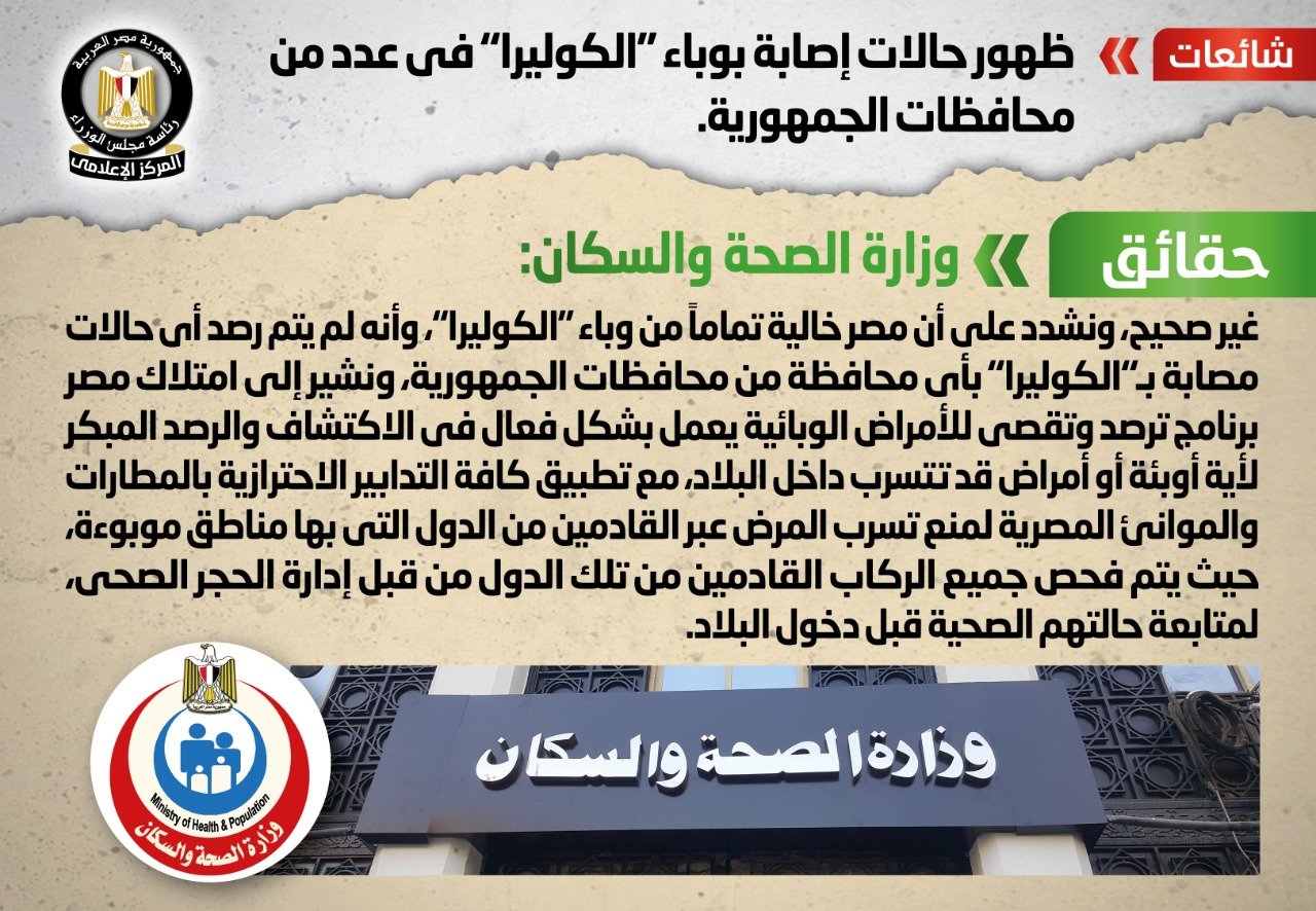 نفى المركز الإعلامي لمجلس الوزراء ما انتشر من أنباء حول ظهور حالات إصابة بوباء "الكوليرا" في عدد من محافظات الجمهورية.