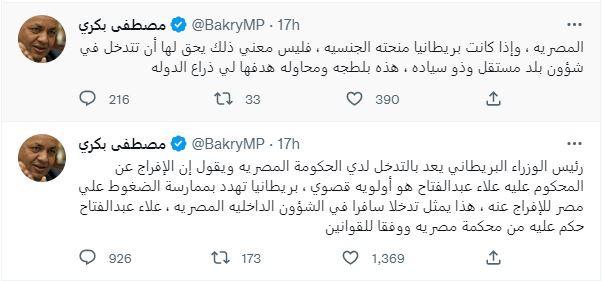 وقال بكري عبر صفحته على موقع تويتر: "رئيس الوزراء البريطاني يعد بالتدخل لدي الحكومة المصريه ويقول إن الإفراج عن المحكوم عليه علاء عبدالفتاح هو أولويه قصوي، بريطانيا تهدد بممارسة الضغوط على مصر للإفراج عنه، هذا يمثل تدخلا سافرا في الشؤون الداخليه المصريه".