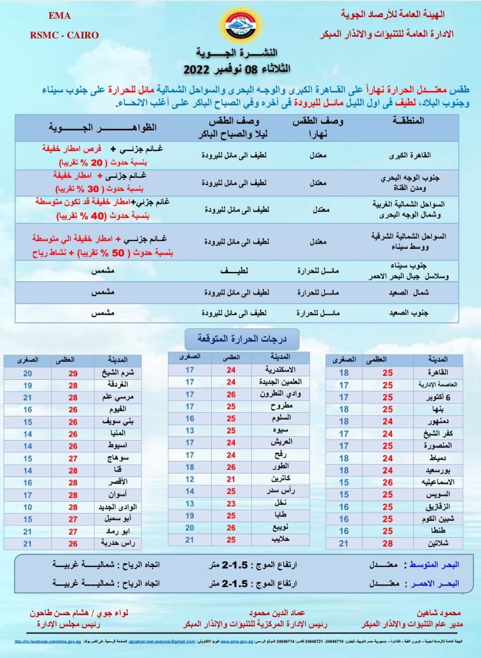 وذكرت الهيئة فى بيانها، أنه من المتوقع سقوط أمطار خفيفة إلى متوسطة على مناطق من السواحل الشمالية وشمال الوجه البحرى على فترات متقطعة، وأمطار خفيفة على مناطق من جنوب الوجه البحرى ومدن القناة قد تمتد إلى مناطق من القاهرة الكبرى على فترات متقطعة، كما متوقع نشاط الرياح على مناطق من السواحل الشرقية على فترات متقطعة.