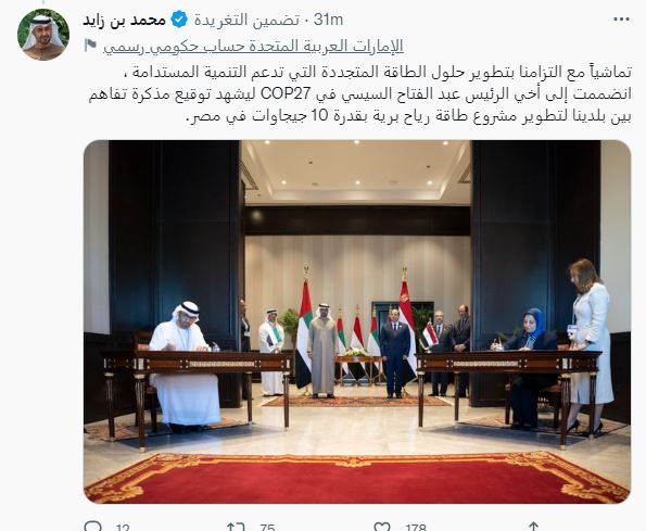 وقال رئيس الإمارات عبر حسابه الرسمي على “تويتر” إنه وأخيه الرئيس السيسي شهدا اليوم الثلاثاء توقيع اتفاقية لإنشاء مشروع طاقة رياح في مصر بقدرة 10 جيجاوات.