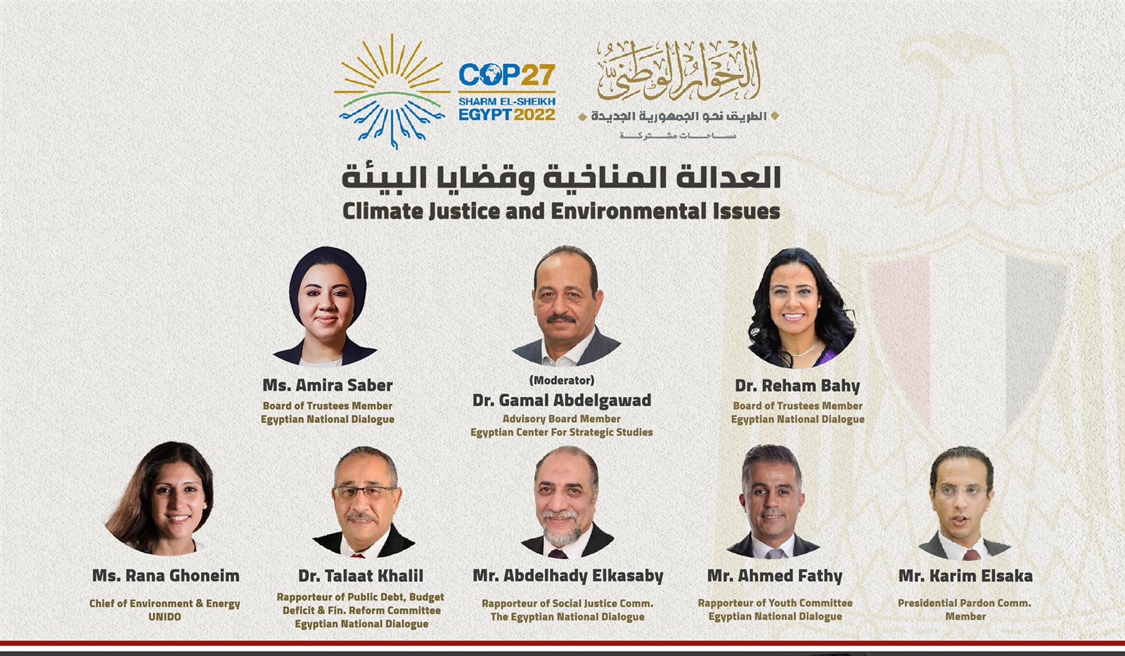 نظّم مجلس أمناء الحوار الوطني جلسة بعنوان "العدالة المناخية وقضايا البيئة"، اليوم السبت الموافق ١٢ نوفمبر ٢٠٢٢ من الساعة ١٢ ظهرًا بالمنطقة الخضراء لمؤتمر قمة المناخ.