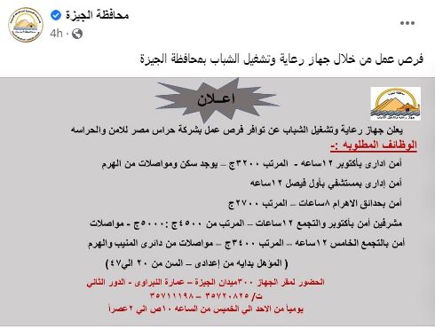 كشفت محافظة الجيزة، عبر منشور لها على صفحتها الرسمية بموقع التواصل الاجتماعي "فيس بوك"، عن إعلان جهاز رعاية وتشغيل الشباب بالمحافظة، توافر فرص عمل بإحدى شركات الأمن والحراسة.