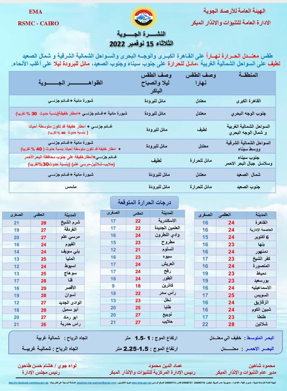 وبالنسبة لحالة البحر المتوسط فتكون خفيفة إلى معتدلة، وارتفاع الموج فيه من متر إلى 1،5 متر، والرياح السطحية شمالية غربية، أما حالة البحر الأحمر فهى معتدلة، وارتفاع الموج فيه من 1،5 متر إلى 2.25 متر، والرياح السطحية شمالية غربية.