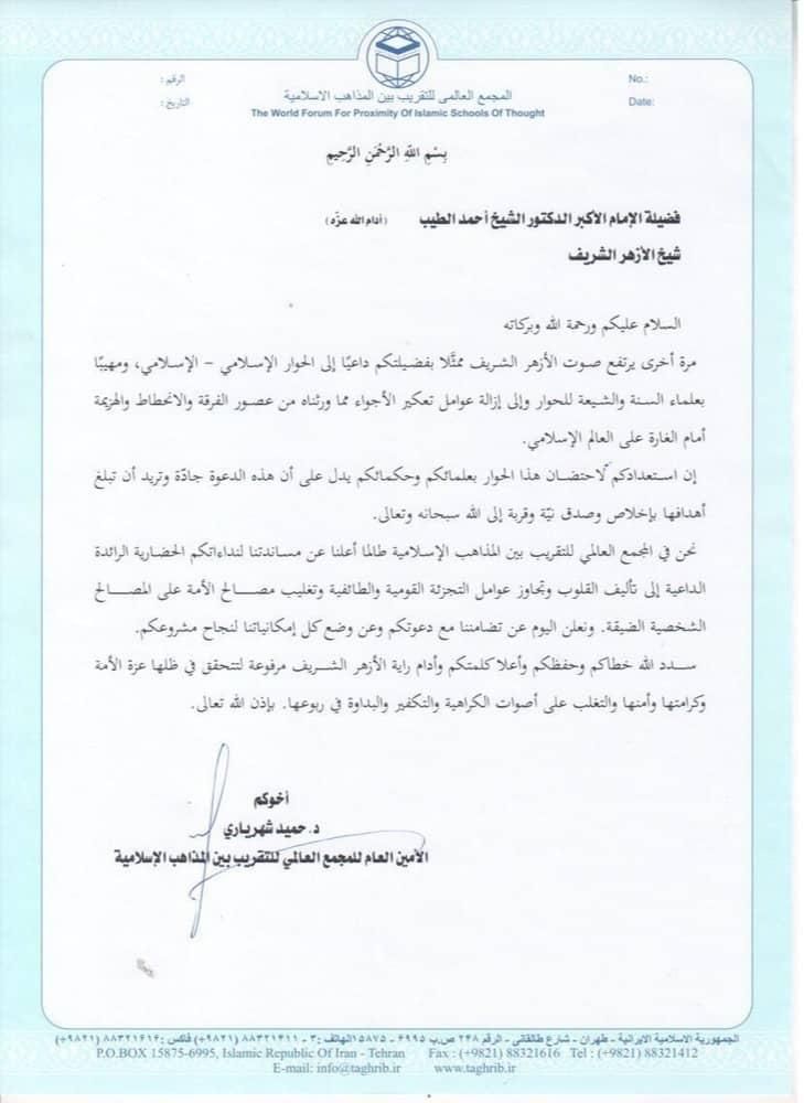 أعقب بيان "مجمع التقريب"، دعوة من الشيخ حميد شهرياري، لشيخ الأزهر الإمام الأكبر أحمد الطيب، إلى زيارة إيران ووضع الأسس الأولية للحوار الإسلامي الإسلامي، مؤكدًا استعدادهم للذهاب بوفدٍ من مجمع التقريب إلى القاهرة للقاء شيخ الأزهر ومناقشة موضوع الحوار.