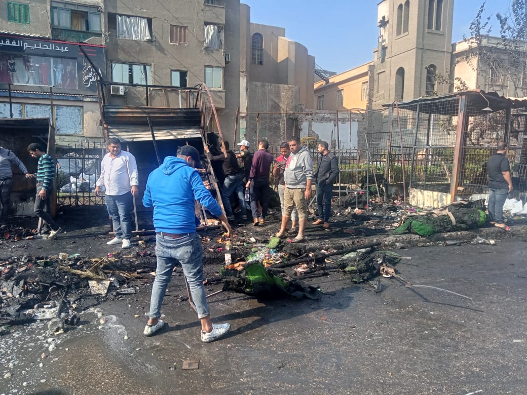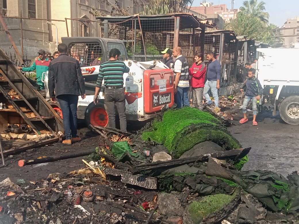 رفع رجال حي الموسكى بالقاهرة آثار الحريق الذى نشب صباح اليوم الثلاثاء، فى عدد من أكشاك بيع الورد فى سوق غزة القديم.