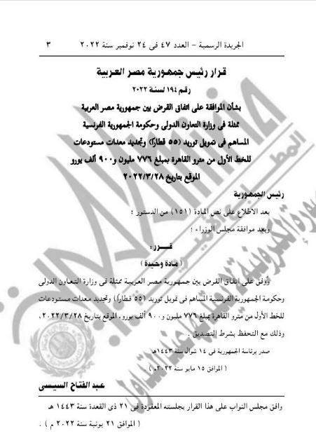 أصدر الرئيس عبدالفتاح السيسى القرار الجمهورى رقم 194 لسنة 2022 بشأن الموافقة على اتفاق القرض بين مصر ممثلة فى وزارة التعاون الدولى وحكومة فرنسا، للمساهمة فى تمويل توريد 55 قطارا، وتجديد معدات ومستودعات للخط الأول من مترو القاهرة بمبلغ 776 مليونا و900 ألف يورو، الموقع بتاريخ 28 مارس 2022.