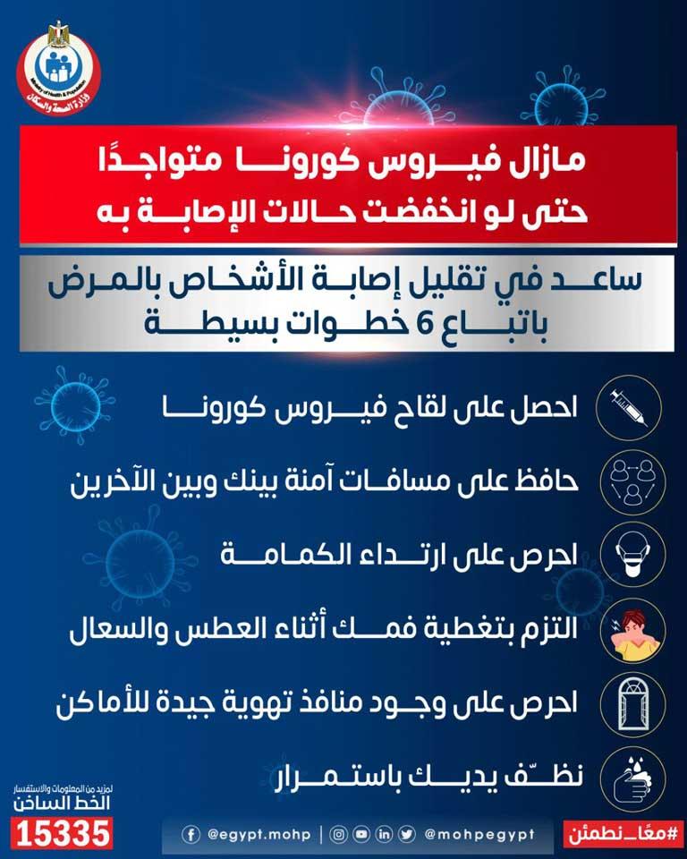 حذرت وزارة الصحة والسكان، من زيادة الإصابات بفيروس كورونا حال التهاون في اتخاذ الإجراءات الاحترازية، مشددا على أن الفيروس ما زال موجودا حتى لو انخفضت معدلات الإصابة به.