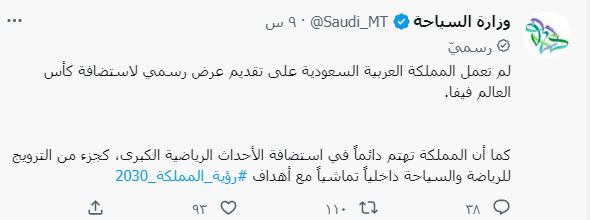 أكدت وزارة السياحة السعودية، اليوم الأربعاء، أن المملكة لم تدرس تقديم عرض مشترك لاستضافة كأس العالم 2030 بالتعاون مع مصر واليونان.