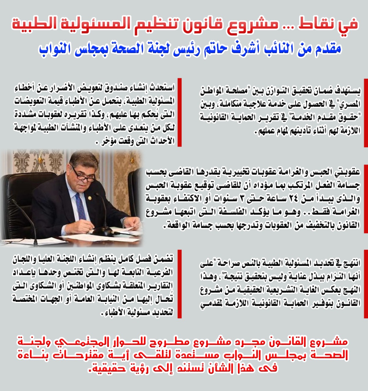 تقدم د. أشرف حاتم رئيس لجنة الصحة بمجلس النواب، بمشروع قانون بإصدار قانون تنظيم المسئولية الطبية.