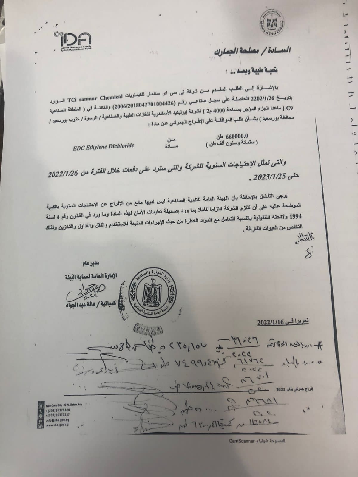 وقال فرغلي: «إن السماح بدخول 660 ألف طن من مادة ثاني كلوريد الإيثيلين كارثة بيئية ببورسعيد، بموافقة وتحايل هيئه التنمية الصناعية على القوانين المصرية لصالح شركه سنمار».