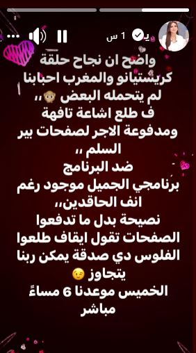 وأضافت: «واضح أن نجاح حلقة كريستيانو والمغرب أحبابنا لم يتحمله البعض، فـ طلع إشاعة تافهة ومدفوعة الأجر لصفحات بير السلم ضد البرنامج، برنامجي الجميل موجود رغم أنف الحاقدين».