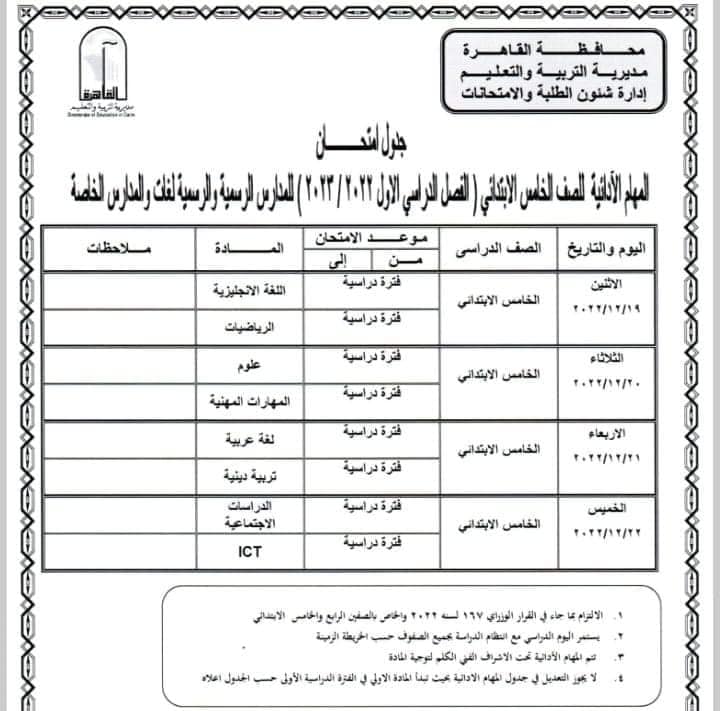 ومن المقرر عقد امتحان المهام الأدائية للصف الخامس الابتدائي في شهر ديسمبر الجاري، وذلك قبل بدء امتحانات نصف العام الدراسي، حسب الخريطة الزمنية للعام الدراسي 2022-2023.