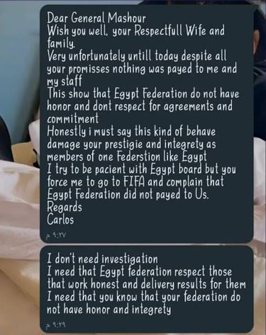 وختم كيروش رسالته لـ مشهور بالقول: "أحاول أن أكون متسامحًا مع مجلس إدارة مصر لكنك تجبرني على الذهاب إلى فيفا وشكوى اتحادكم".