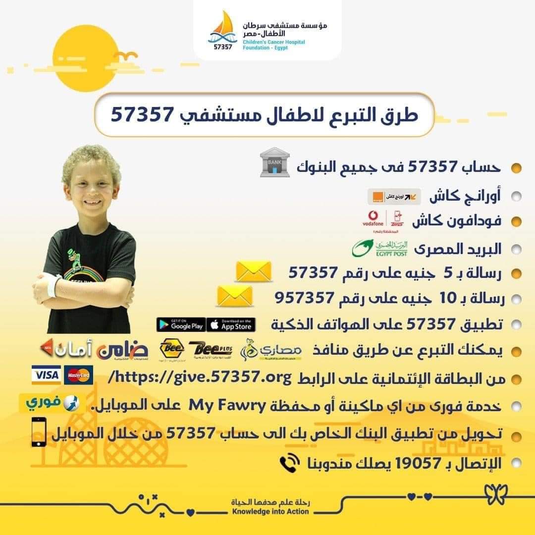 وكتب مستخدم عبر فيس بوك: مستعدين طيب لمواجهة كارثة غلق مستشفى 57357، انتوا متخيلين حجم الأطفال مرضى السرطان في مصر قد إيه، مدة العلاج قد إيه، ثمن العلاج خلال المدة دي، ارجعوا اتبرعوا يا جماعة، صدقوني الكارثة كبيرة لو المستشفى دي قفلت، لأنها مش بتعالج وبس، دي بتطور العلاج كمان.