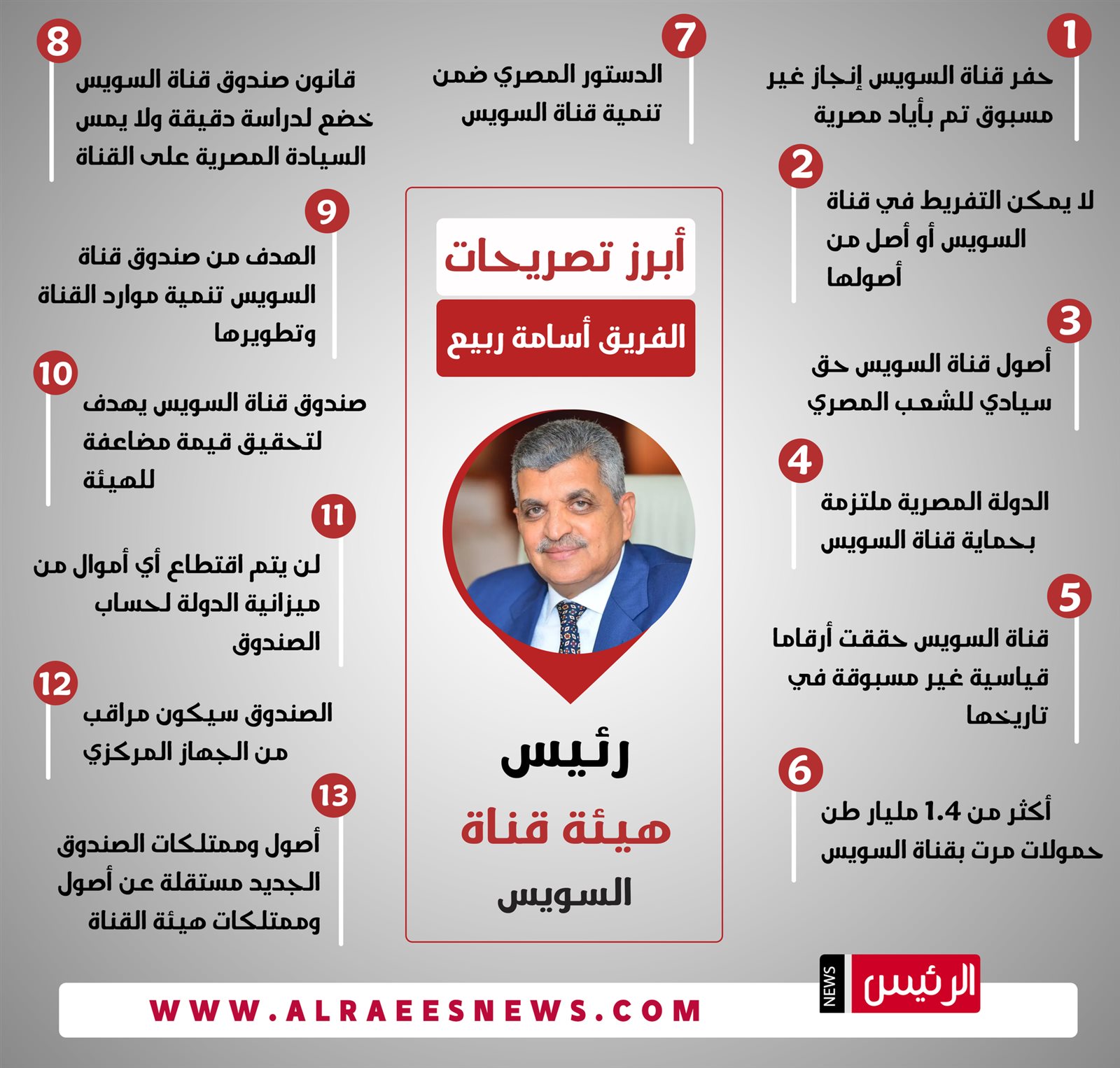 وجائت أبرز تصريحات الفريق أسامة ربيع عن إنجازات قناة السويس كالأتى