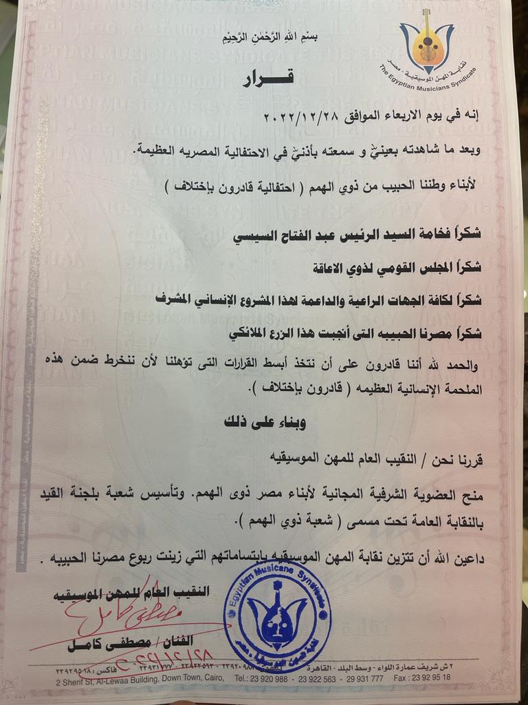 وجاء في نص بيان «المهن الموسيقية»: «وبعد ما شاهدته بعيني وسمعته بأذني في الاحتفالية المصرية العظيمة لأبناء وطننا الحبيب من ذوي الهمم احتفالية قادرون باختلاف شكرا الرئيس عبد الفتاح السيسي، شكرا المجلس القومي لذوي الاعاقة، شكرا لكافة الجهات الراعية والداعم لهذا المشروع الإنساني المشرف، شكرا مصرنا الحبيبة التي أنجبت هذا الزرع الملائكي، والحمد لله إننا قادرون على أن نتخذ أبسط القرارت التي تؤهلنا لأن ننخرط ضمن هذه الملحمة الإنسانية العظيمة قادرون باختلاف، وبناء على ذلك قررنا النقيب العام للمهن الموسيقية، منح العضوية الشرفية المجانية لأبناء مصر ذوي الهمم، وتأسيس شعبة بلجنة القيد بالنقابة العامة تحت مسمى شعبة ذوي الهمم، داعين الله أن تتزين نقابة الموسيقيين بابتساماتهم التي زينت ربوع مصرنا الحبيبة».