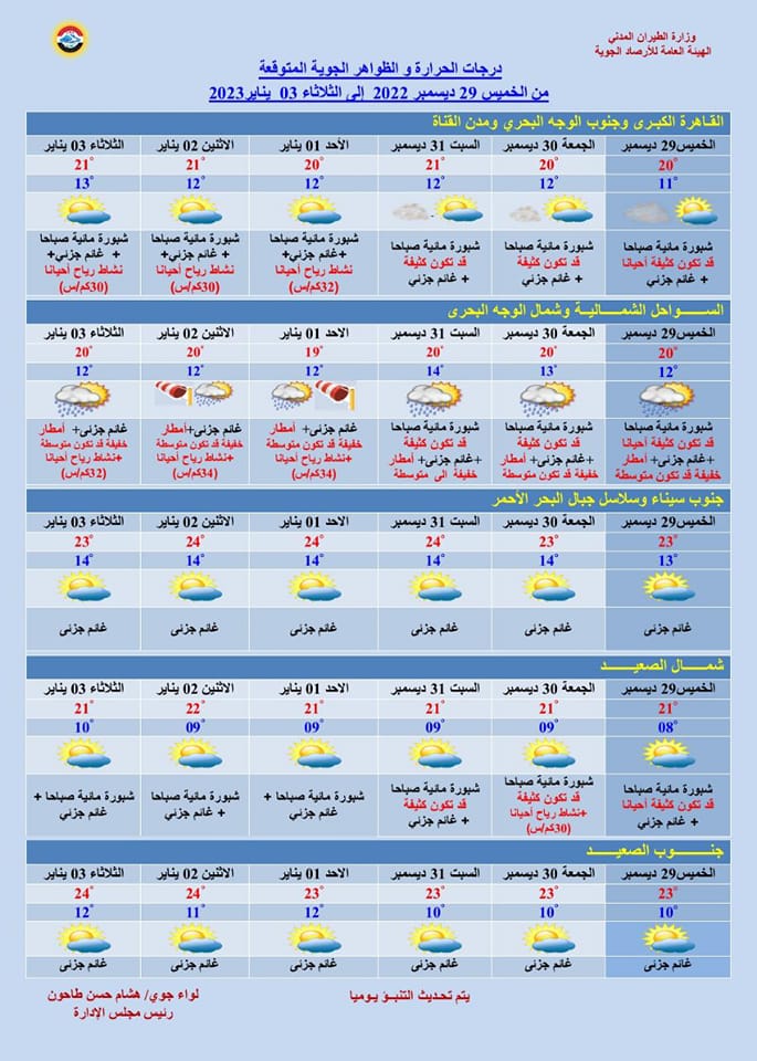 وقالت الأرصاد، على صفحتها الرسمية على موقع التواصل الاجتماعى فيسبوك، إنه من المتوقع أن يسود طقس بارد في الصباح الباكر، لطيف نهارا على القاهرة الكبرى والوجه البحري والسواحل الشمالية وشمال الصعيد، معتدل على جنوب سيناء وجنوب الصعيد..بينما يسود طقس بارد ليلا على أغلب الأنحاء.
