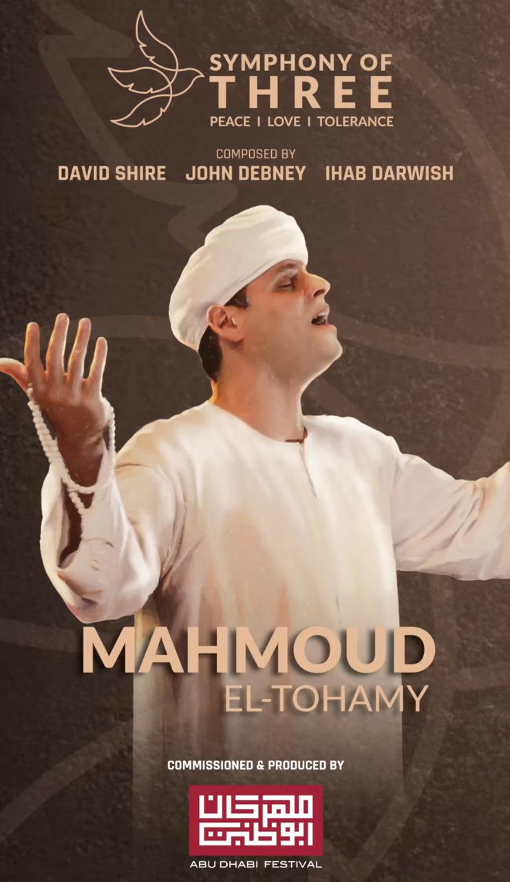 يشارك المنشد محمود التهامي في السيمفونية العالمية "سلام حب تسامح" التي تجمع أكثر من 300 موسيقي من مختلف دول العالم تحت مظلة مهرجان أبو ظبي في دورته التاسعة عشرة.