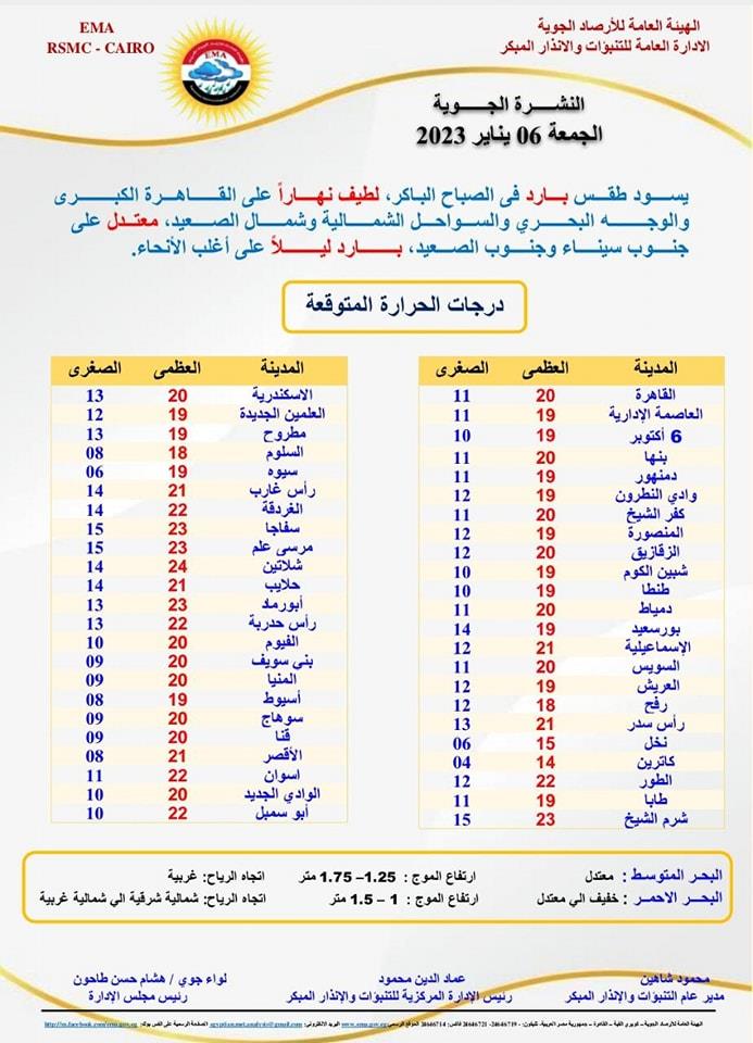 كشفت الهيئة العامة للأرصاد الجوية، تفاصيل حالة الطقس المتوقعة اليوم الجمعة 6 يناير 2023.