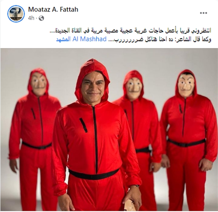 وبعد إعلان معتز عبدالفتاح خبر تعاقده مع قناة "المشهد"، ظهر في صورة غريبة نشرها عبر صفحته الرسمية بموقع التواصل الاجتماعي “فيس بوك”، وهو مرتديا زي نفس الذي يرتديه أبطال المسلسل الأسباني الشهير "la casa de papel".