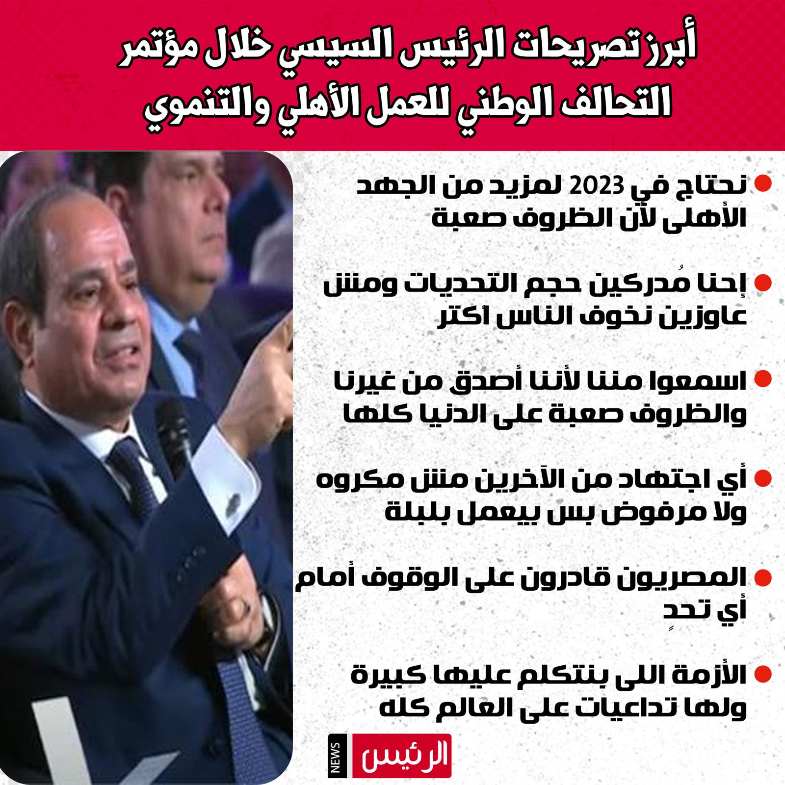 وفى النهاية دعا الرئيس عبدالفتاح السيسي، المساهمين في التحالف الوطني إلى مضاعفة الجهود خلال العام الجارى 2023، قائلا: "كنا بنقول عام 2022 إنه عام المجتمع المدني، بس بصراحة ظروف 2023 يمكن تكون محتاجة مننا إحنا نبذل جهد أكتر من 2022، لأن الأزمة اللى بنتكلم عليها أزمة كبيرة ولها تداعيات على العالم كله، ولها تأثير كبير، وبالتالي إذا كانت منظمات المجتمع المدني محتاجة تشتغل وكيان التحالف اشتغل بهمة وضغط كبير خلال 2022 أتصور أن الجهد يحتاج أن يتضاعف هذا الجهد خلال 2023.
