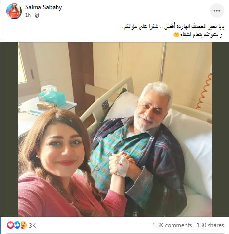 ونشرت «صباحي» على حسابها على موقع التواصل الاجتماعي «فيسبوك»، صورة رفقة والدها من داخل المستشفي، مضيفة: "بابا بخير الحمدلله النهارده أفضل.. شكرا على سؤالكم.. ودعواتكم بتمام الشفاء".