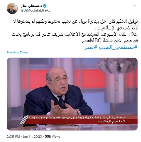 أثار الدكتور مصطفى الفقى، الكاتب والمفكر السياسي الجدل بعد تصريحاته في برنامج “يحدث في مصر” المذاع على قناة “mbc مصر”، حين قال إن توفيق الحكيم كان أحق من نجيب محفوظ بجائزة نوبل في الأدب، حيث أن اللجنة المانحة في الأكاديمية السويدية لم تمنحه الجائزة لأنه كتب في الإسلاميات.