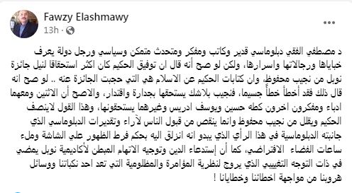 وأضاف العشماوي عبر صفحته الشخصية على موقع التواصل الاجتماعي “فيس بوك”: “د. مصطفي الفقي دبلوماسي قدير وكاتب ومفكر ومتحدث متمكن وسياسي ورجل دولة يعرف خباياها ورجالاتها واسرارها، ولكن لو صح أنه قال ان توفيق الحكيم كان اكثر استحقاقا لنيل جائزة نوبل من نجيب محفوظ، وأن كتابات الحكيم عن الاسلام هي التي حجبت الجائزة عنه.. فقد أخطأ خطأً جسيما، فنجيب بلاشك يستحقها بجدارة واقتدار”.