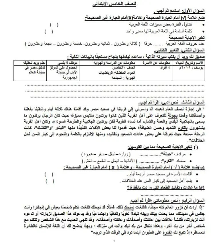 "متوفر للطلاب".. نماذج الوزارة للصف الخامس الابتدائي 2023 لغة عربية