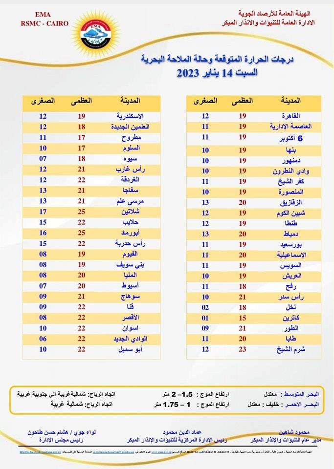 ونشرت الأرصاد بيانا بدرجات الحرارة المتوقعة اليوم السبت 14 يناير 2023، في محافظات مصر وجاء على النحو التالي: