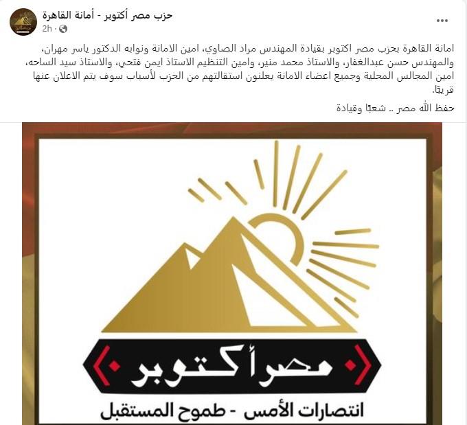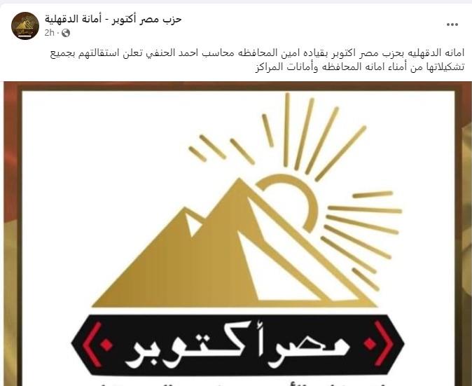 في السياق ذاته، أعلنت أمانة الدقهلية بحزب مصر أكتوبر، تقديم استقالة جماعية، وذكر في بيانه أن الأمانة بقيادة أمين المحافظة محاسب أحمد الحنفي تعلن استقالتهم بجميع تشكيلاتها من أمناء أمانة المحافظة وأمانات المراكز.
