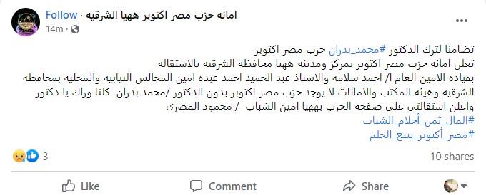 وجاء نص البيان: "تضامنا لترك الدكتور محمد بدران حزب مصر اكتوبر.. تعلن أمانة حزب مصر اكتوبر بمركز ومدينه ههيا محافظة الشرقيه بالاستقالة بقياده الأمين العام أحمد سلامه وعبد الحميد احمد عبده أمين المجالس النيابية والمحلية بمحافظة الشرقية، وهيئة المكتب، والأمانات.. لا يوجد حزب مصر اكتوبر بدون الدكتور محمد بدران، كلنا وراك يا دكتور وأعلن استقالتي علي صفحه الحزب بههيا أمين الشباب محمود المصري.. وان الشباب قادرون على الوقوف أمام أي تحد"، وقاموا بتفعيل هاشتاج " المال ثمن أحلام الشباب.. مصر أكتوبر بيبيع الحلم".