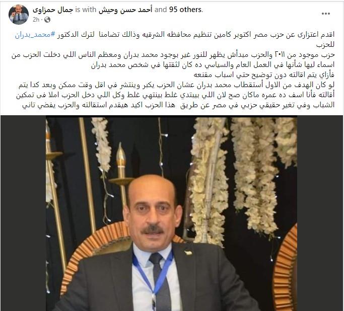 كما أعلن جمال حمزاوي أمين تنظيم الحزب في محافظة الشرقية، وأحد أعضاء مصر أكتوبر البارزين عن استقالته حيث قال “أقدم اعتذارى عن حزب مصر أكتوبر كأمين تنظيم محافظة الشرقية، تضامنا لترك الدكتور محمد بدران للحزب”، لافتًا إلى أن الحزب موجود من ٢٠١١، والحزب مبدأش يظهر للنور غير بوجود محمد بدران، ومعظم الناس اللي دخلت الحزب من أسماء ليها شأنها في العمل العام والسياسي ده كان لثقتها في شخص محمد بدران.