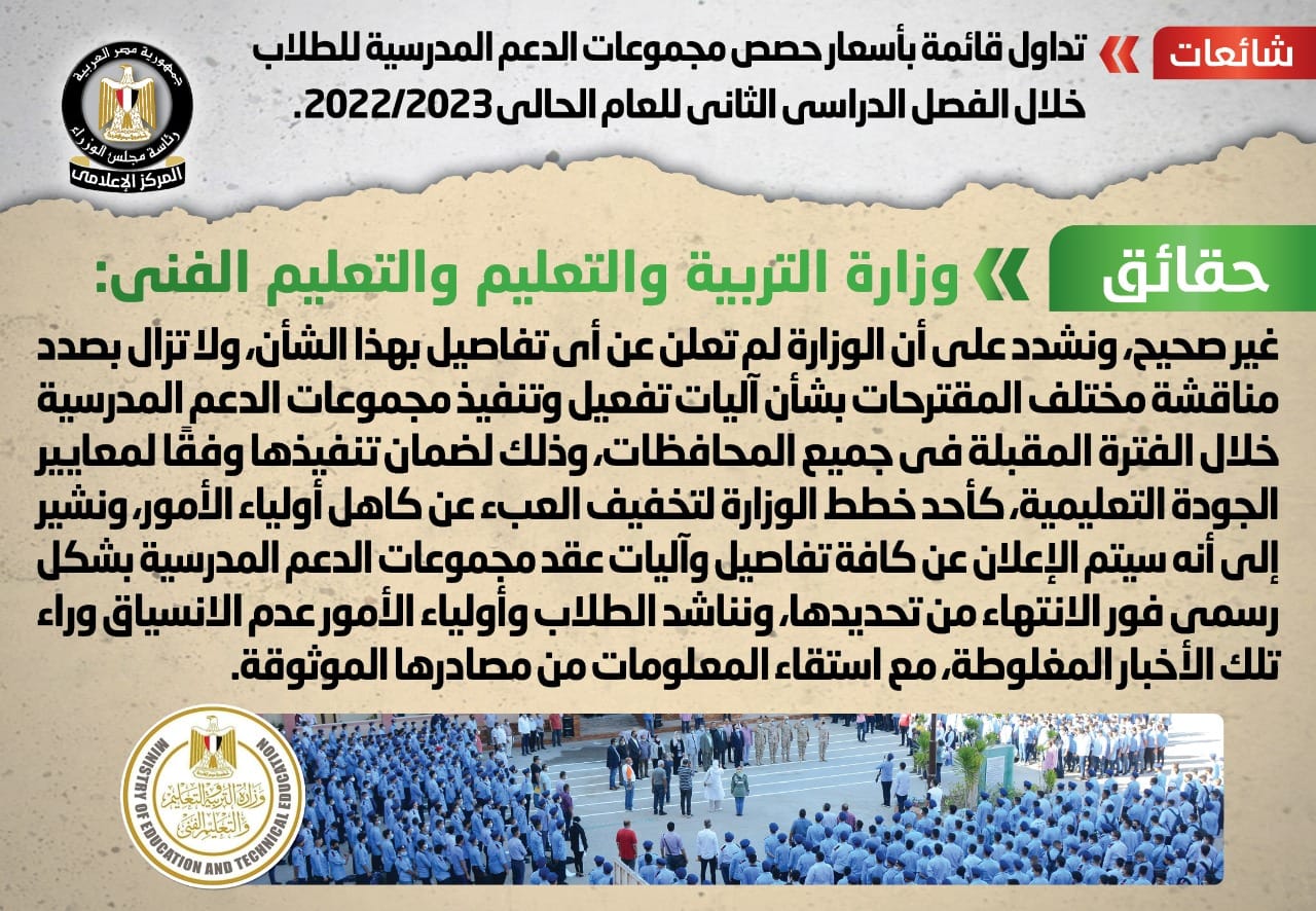 نفى المركز الإعلامي لمجلس الوزراء ما انتشر من أنباء بشأن انتشار قائمة بأسعار حصص مجموعات الدعم المدرسية للطلاب خلال الفصل الدراسي الثاني للعام الحالي 2022 /2023.