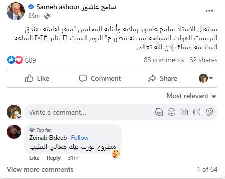 وفي منشور أخر، أعلن سامح عاشور أنه سيلتقي زملائه وأبنائه المحامين بمقر إقامته بمدينة مطروح، اليوم السبت، الساعة السادسة مساءً بإذن الله تعالى.