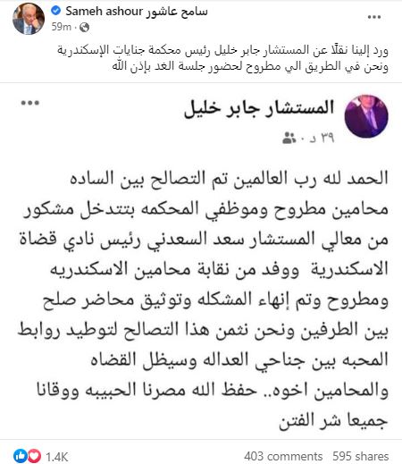 ونقل عاشور عبر صفحته الشخصية على موقع التواصل الاجتماعي “فيس بوك”، تصريحات للمستشار جابر خليل رئيس محكمة جنايات الإسكندرية، الذي أكد التصالح بين المحامين والموظفين بعد محاولات للصلح من المستشار سعد العسدني رئيس نادي قضاة الإسكندرية، ووفد من نقابة محامين الإسكندرية ومرسى مطروح، منوهًا أنه تم توثيق محاضر الصلح بين الطرفين.