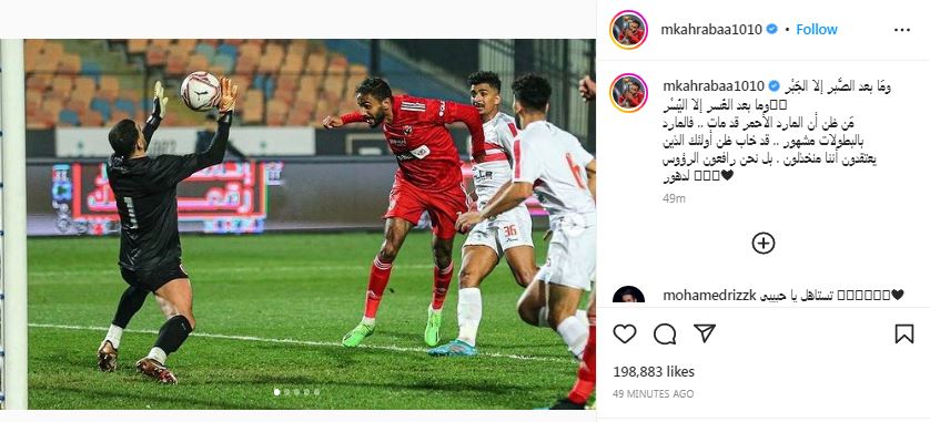 نشر محمود كهربا، لاعب النادي الأهلي، صورا من مباراة فريقه أمس أمام الزمالك التى انتهت بثلاثية نظيفة، عبر حسابه الشخصي بموقع إنستجرام.