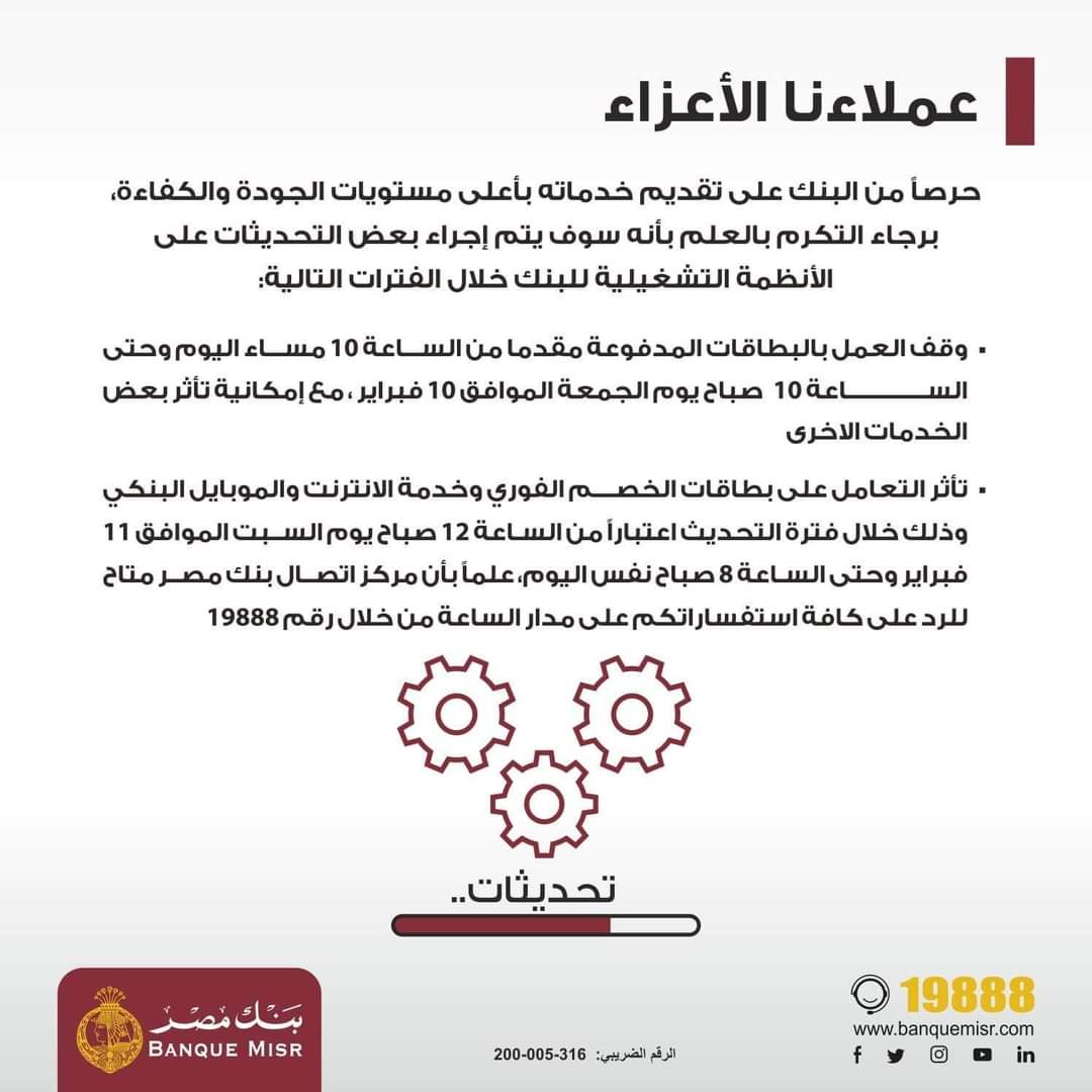 - تأثر التعامل على بطاقات الخصم الفوري وخدمة الانترنت والموبايل البنكي وذلك خلال فترة التحديث اعتبارًا من الساعة 12 صباح يوم السبت الموافق 11 فبراير وحتى الساعة 8 صباح نفس اليوم، علمًا بأن مركز اتصال بنك مصر متاح للرد على كافة استفساراتكم على مدار الساعة من خلال رقم 19888