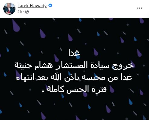 وأضاف العوضي، في تدوينة عبر حسابه الشخصي بموقع التواصل الاجتماعي “فيسبوك”: "المستشار هشام جنينة قضي كامل المدة المحكوم بها والتي تنتهي صباح غد".