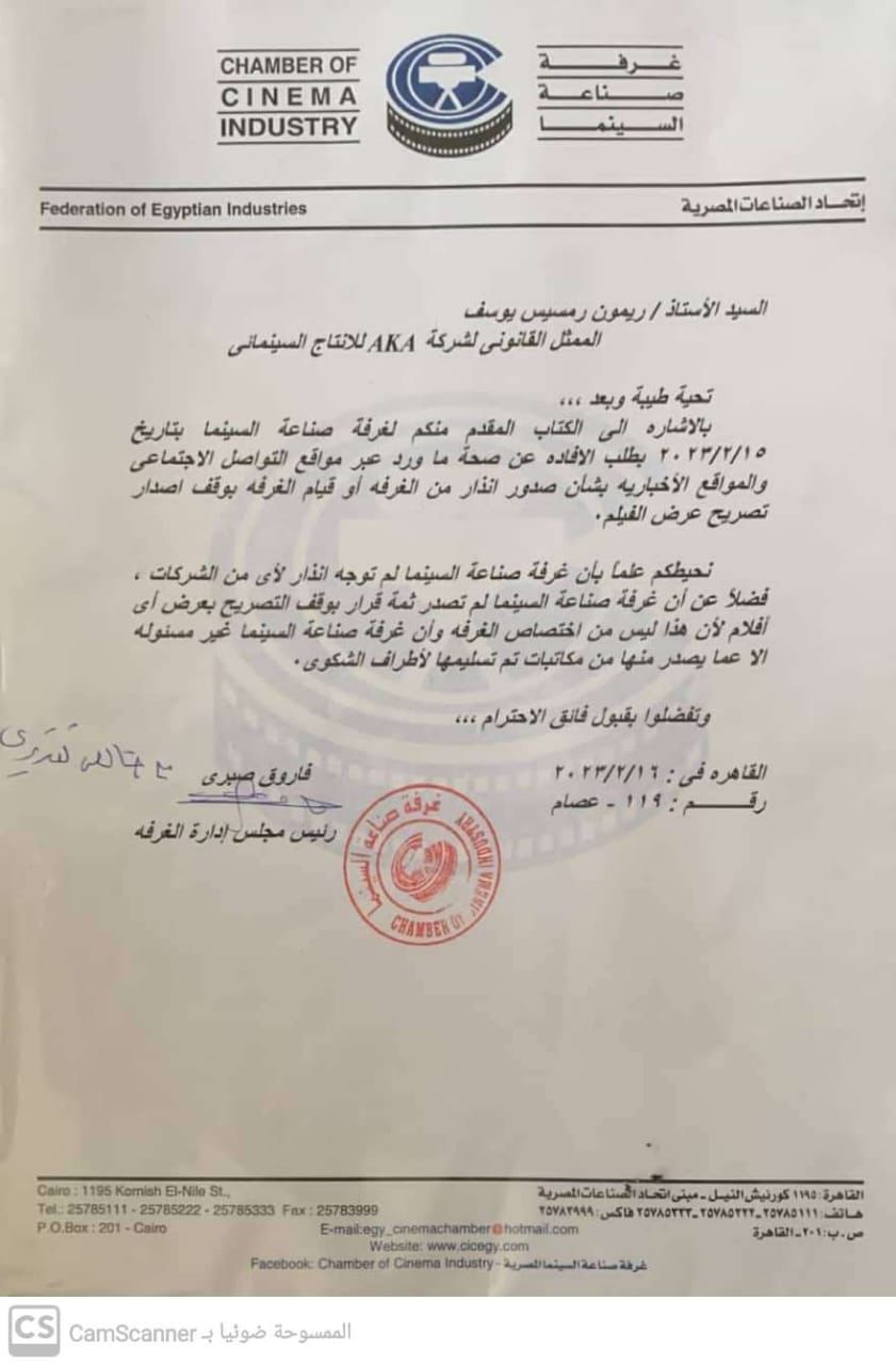 وأرسلت غرفة صناعة السينما خطابًا إلى المنتجين "ريمون رمسيس وأحمد خالد موسى وإيمان عبدالرحمن" توضح فيه حقيقة ما تم نشره من أخبار مغلوطة، وجاء في الخطاب:"بالإشارة إلى الكتاب المقدم منكم لغرفة صناعة السينما بتاريخ 15/2/2023 بطلب الإفادة عن صحة ما ورد عبر مواقع التواصل الإجتماعى والمواقع الإخبارية بشأن صدور انذار من الغرفة أو قيام الغرفة بوقف تصريح عرض الفيلم".