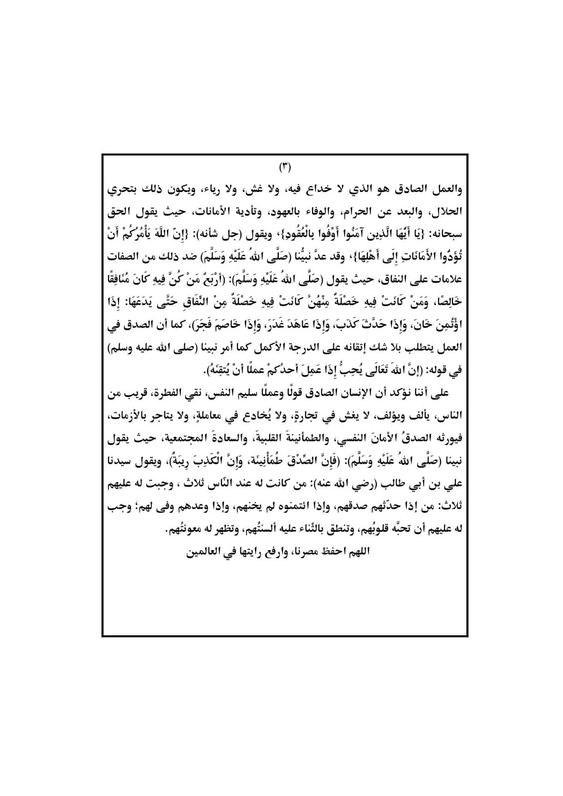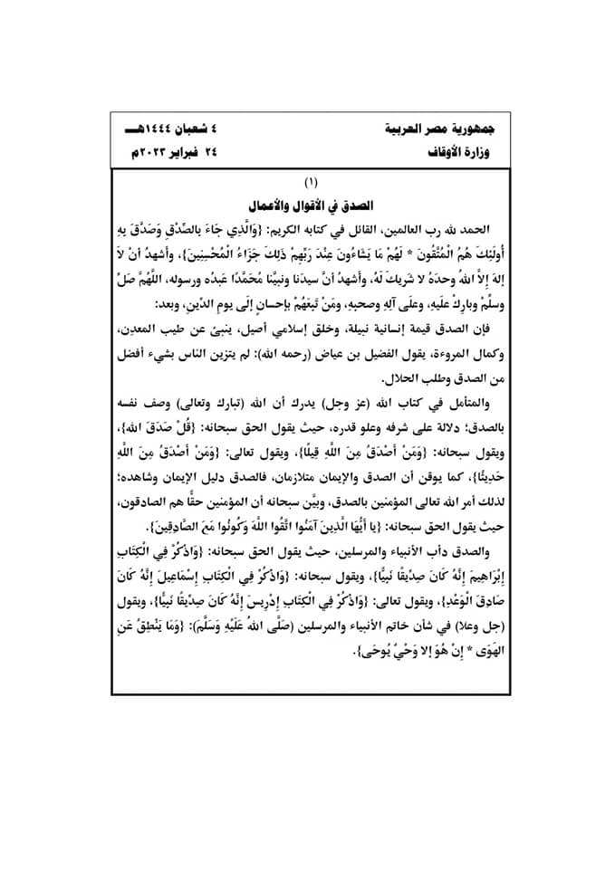 وقررت الأوقاف، أن يكون موضوع يوم الجمعة القادمة الموافق 24 فبراير 2023، بعنوان «الصدق في الأقوال والأعمال»، مشددة على الأئمة ضرروة الالتزام بموضوع الخطبة نصًا أو مضمونًا على أقل تقدير، وألا يزيد زمن الخطبة عن 10 دقائق.