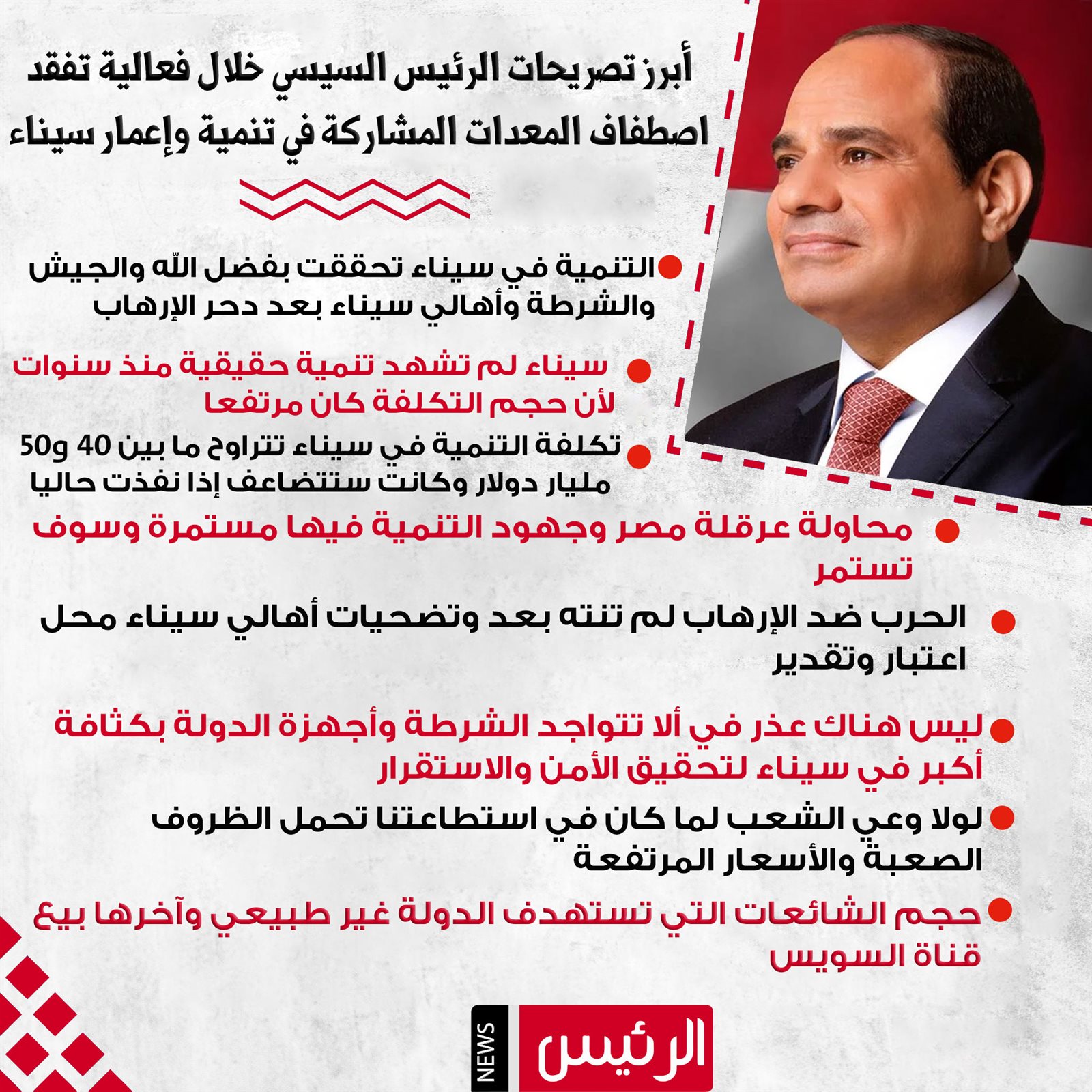 - التنمية في سيناء تحققت بفضل الله والجيش والشرطة وأهالي سيناء بعد دحر الإرهاب