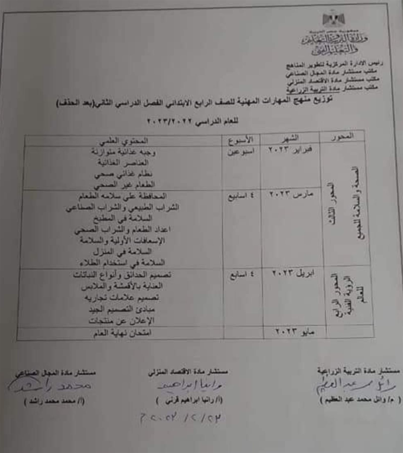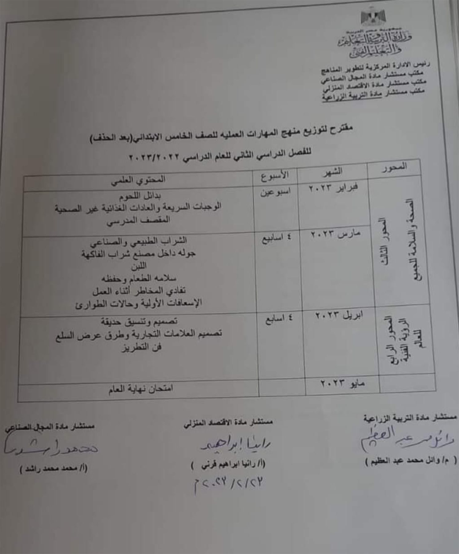 أعلنت وزارة التربية والتعليم والتعليم الفني، توزيع منهج المهارات المهنية والعملية للصفين الرابع والخامس والابتدائي بالفصل الدراسي الثاني (بعد الحذف) للعام الدراسي الحالي 2022-2023.