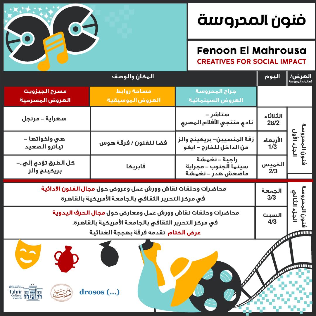 مؤتمر فنون المحروسة تنظمه جمعية نهضة المحروسة بالتعاون مع مؤسسة دروسوس ومركز التحرير الثقافي بالجامعة الأمريكية بالقاهرة وتعقد فعاليات المرحلة الاولى كالتالى: