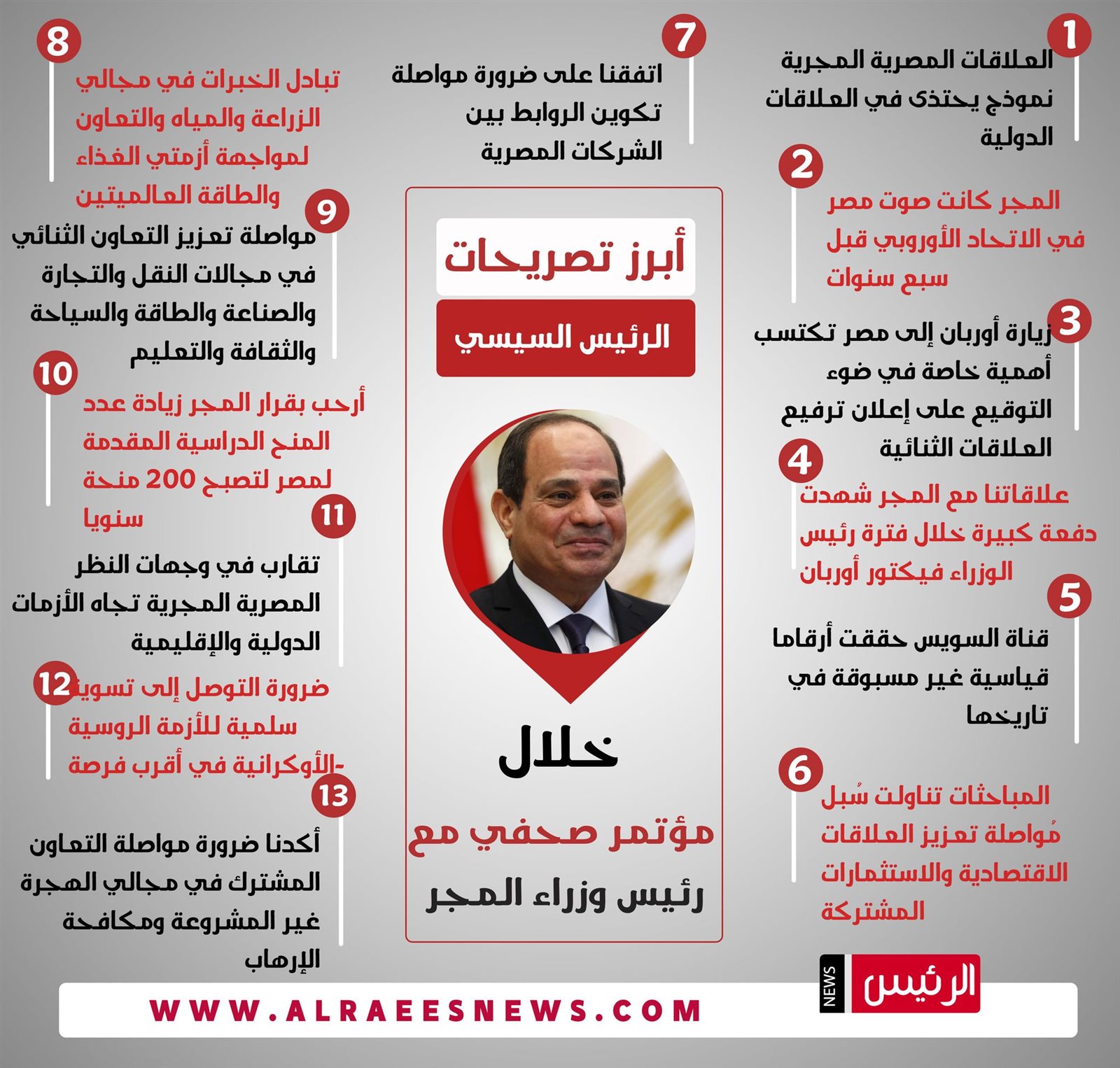 وجاءت أبرز تصريحات الرئيس السيسي خلال مؤتمر صحفي مع رئيس وزراء المجر فيكتور أوربان اليوم الثلاثاء بقصر الاتحادية كالآتي: